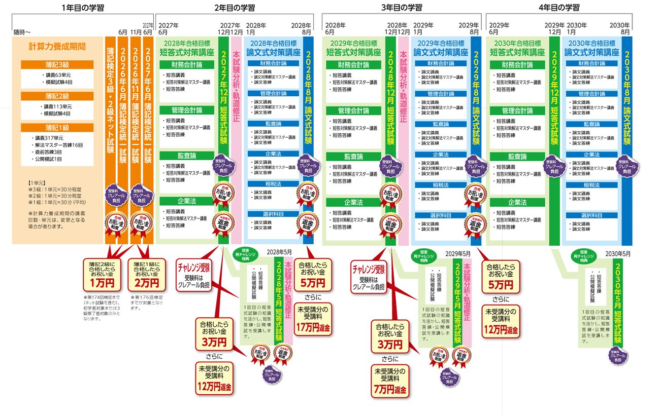 | コース紹介 | 2028・29・30年合格目標 4年トータルセーフティコース ①初学者対象 Web通信 ②簿記3級修了者対象 Web通信 ③簿記2級修了者対象 Web通信 |